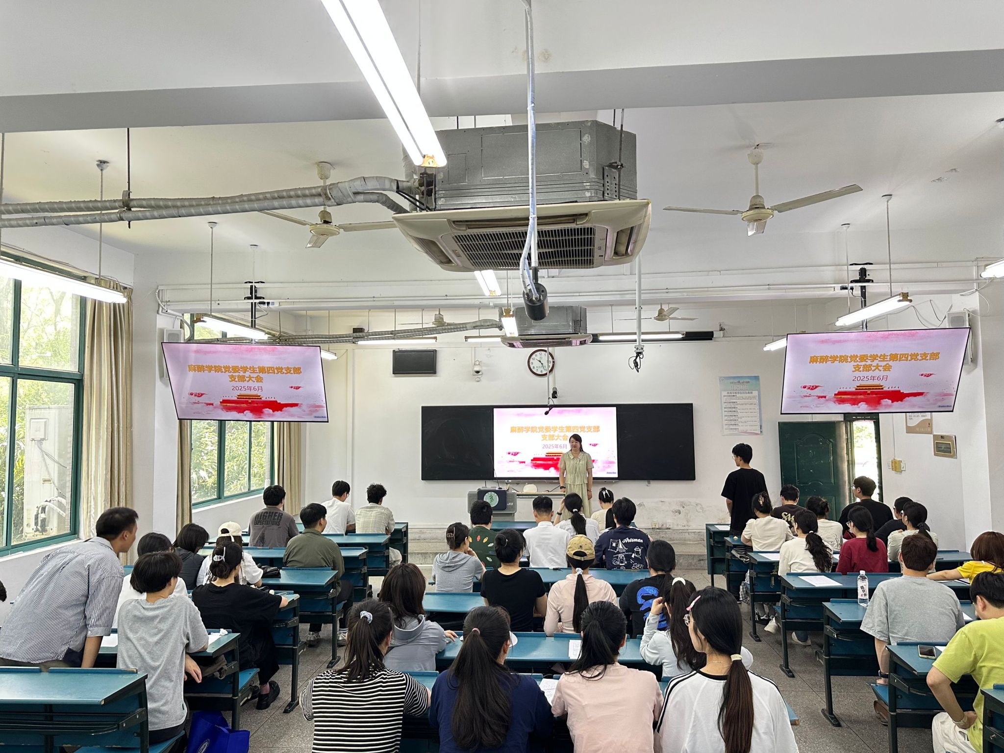 专题学习会上,员工第四党支部组织毕业生党员再次集中学习中央八项规定精神。支部书记汪玉婷重点强调了毕业季期间的党员纪律要求,号召全体毕业生党员以身作则,带头文明离校,以健康、理性的方式表达同窗情谊,自觉维护校园和谐稳定,展现共产党员的优良作风。随后,与会党员共同观看爱国主义影片《我和我的祖国》之《前夜》单元。影片中工程师林治远为保障开国大典国旗顺利升起而争分夺秒、精益求精的感人事迹,深深触动了在场党员。毕业生党员表示,将从中汲取精神力量,在未来的医疗岗位上恪守医德、精进医术,践行医者仁心的初心使命。会议最后,全体同志面向鲜红党旗,重温入党誓词,铿锵誓言表达了毕业生党员们坚定的理想信念和为党的事业奋斗终身的决心。