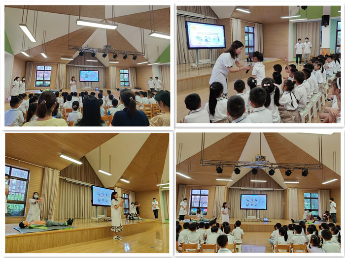 杨伟琼老师生动形象地为园区的老师和小朋友们介绍了防溺水的重要性和急救方法,包括溺水的施救、心肺复苏的“黄金四分钟”和操作方法、急救成功的有效指标以及注意事项等。在讲解的同时,为了便于小朋友更加容易理解,员工党员们还表演了一段情景短剧还原溺水急救的场景,演示正确的心肺复苏术。讲解寓教于乐,深入浅出,充分激发了小朋友们的兴趣。知识要点讲解完毕以后,老师和小朋友依次进行模拟操作。党员同志们耐心指导,纠正错误操作,提示关键要点,精彩地完成了一场形式多样,内涵丰富的安全教育课,切实解决了园区老师和家长员工所面临的难题。