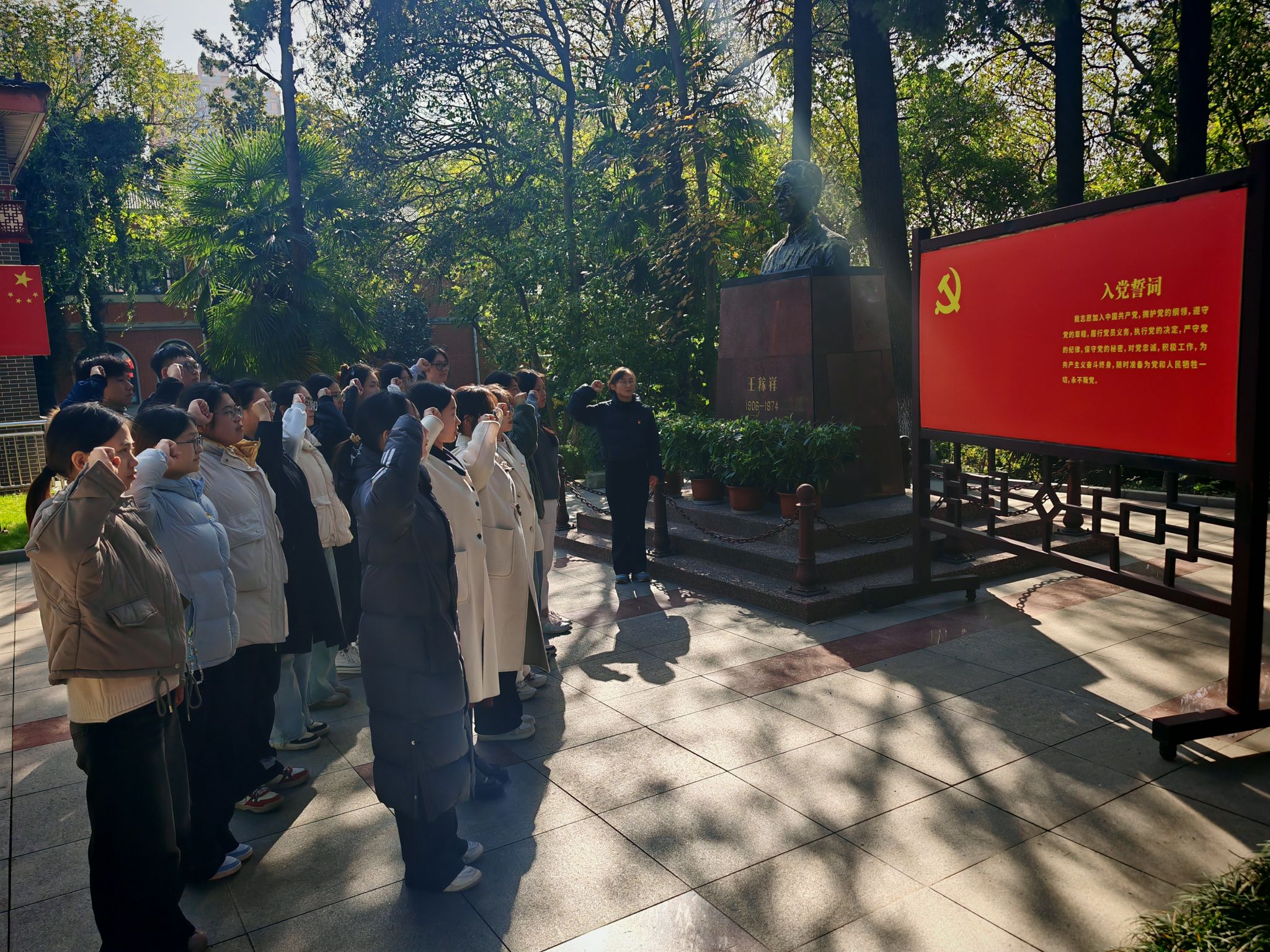 到达场地后,全体新党员在王稼祥同志塑像前整齐列队。面对鲜艳的中国共产党党旗,在领誓人的带领下,大家庄严地举起右拳,以铿锵有力的声音进行了入党宣誓。铮铮誓言回荡在纪念园上空,表达了新党员们为共产主义事业奋斗终身的坚定决心和不忘初心的政治信念。