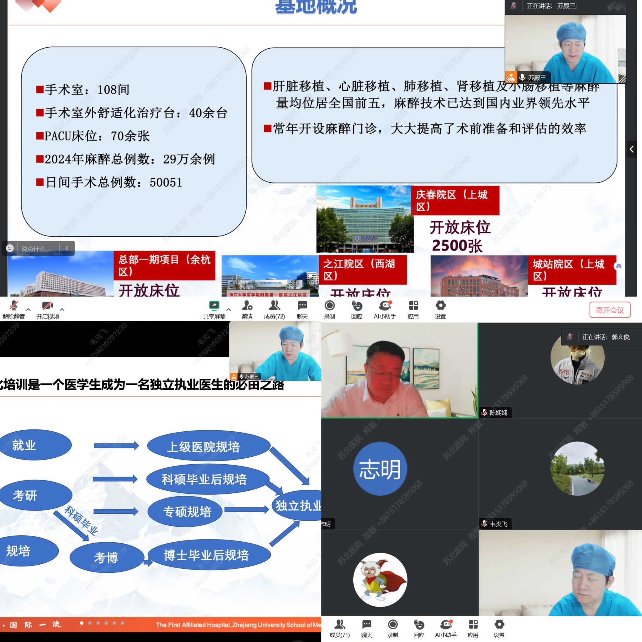 为帮助医学学子深入了解住院医师规范化培训政策,拓宽职业发展视野,122cc太阳成集团于4月7-8日在腾讯会议举办规培基地专题宣讲会。本次活动特邀浙江大学医学院附属第一医院和池州市人民医院的专家团队,就医院概况、规培基地建设及麻醉专业培养特色进行详细介绍,吸引了百余名麻醉学专业员工参与。