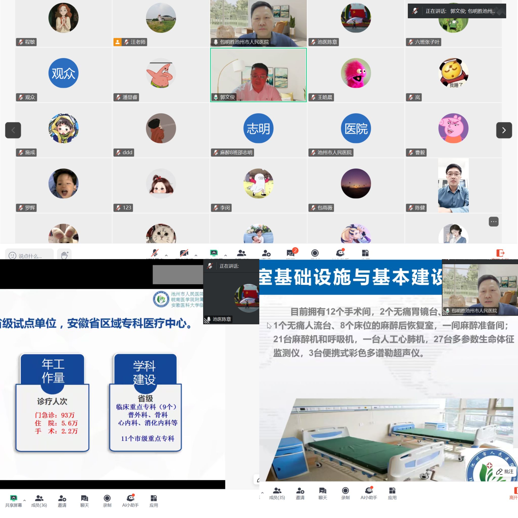 池州市人民医院住培基地陈章主任从医院作为高质量发展省级试点单位、安徽省区域专科医疗中心进行介绍,麻醉专业基地包明胜主任介绍了科室基础设施和团队力量,并明确助力学员快速提升临床操作能力的目标。