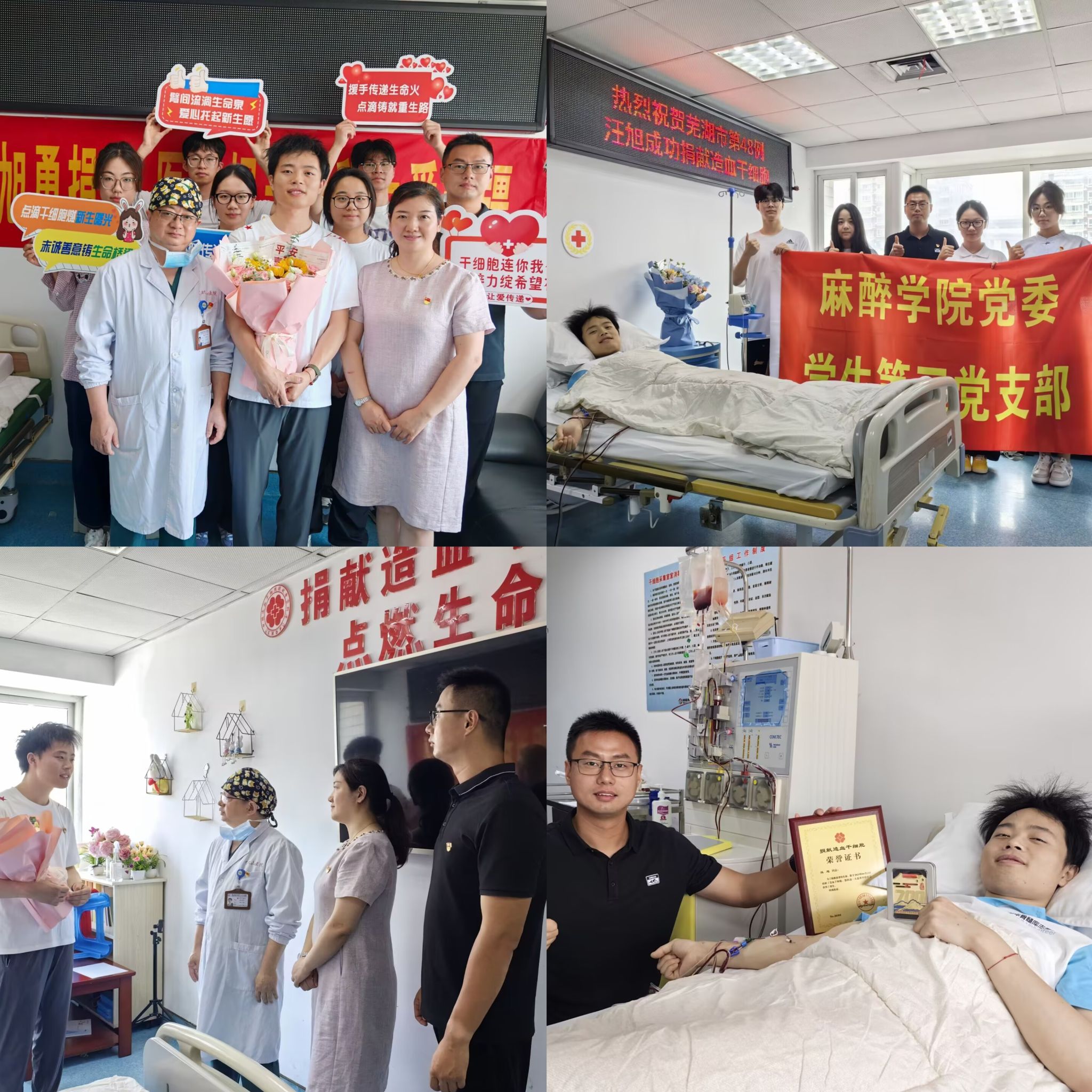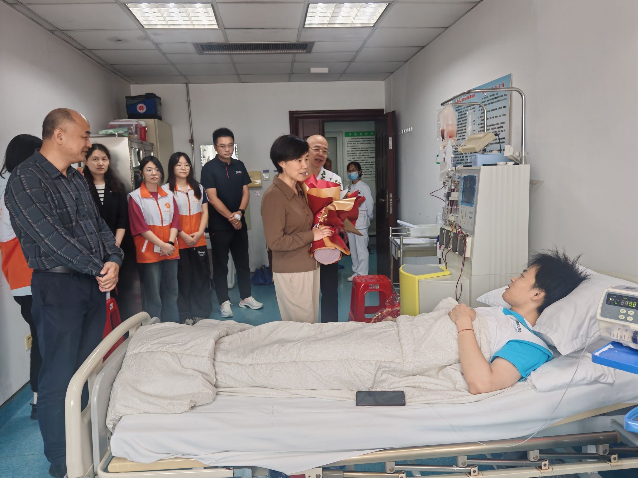 关怀与赞誉,温暖人心的力量。自得知汪旭捐献造血干细胞以来,学校和学院的关怀与同学的温暖便始终萦绕在他身边。住院期间,学院负责人和辅导员多次前往探望,送上鼓励。在捐献的关键时刻,公司党委副书记贾贤燕,公司党委常委、一附公司党委书记陈晓宏专程来到采集现场,看望慰问正在捐献的汪旭同学。贾贤燕与汪旭亲切交谈,高度赞扬他大爱无疆、无私奉献的崇高精神,称其以实际行动践行了医员工的誓言和党员的初心使命,是全校师生的榜样。校领导的关怀与肯定,如一股暖流,不仅温暖了汪旭的心田,也深深鼓舞了在场的每一位师生。