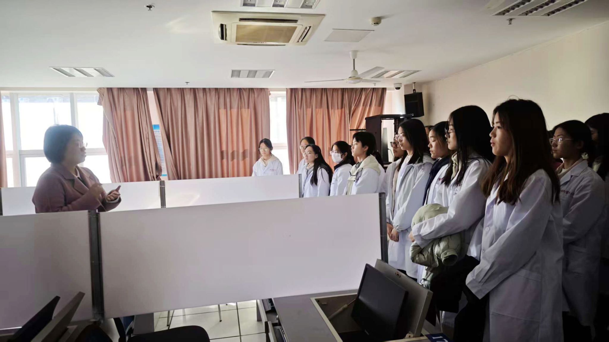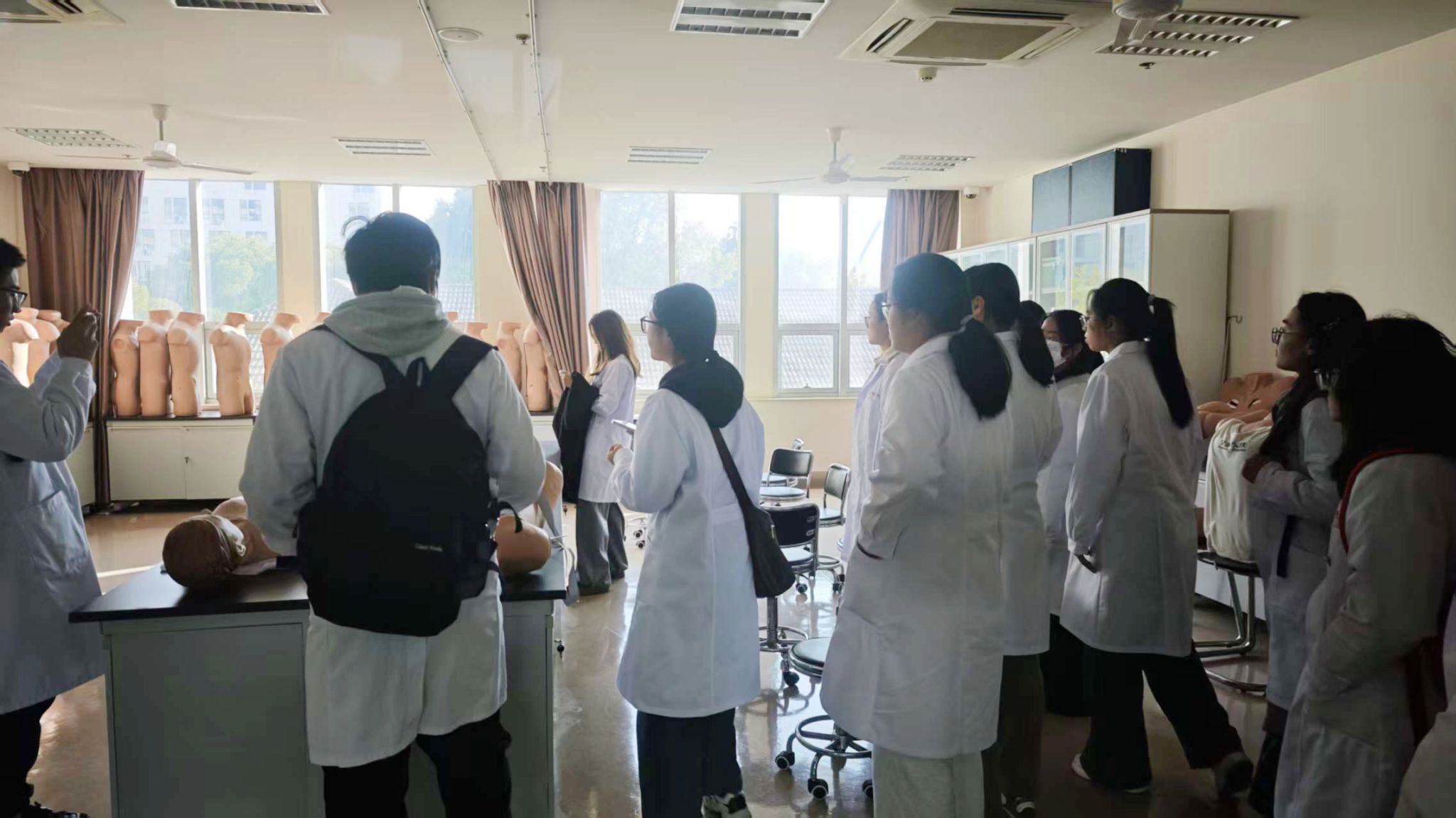 实地观摩,感受标准化考场氛围。在医院工作人员的引导下,同学们依次参观了考场各功能区域:一楼存包安检、宣教候考区秩序井然,二楼第一、二站考核区的多台人机对话设备及标准化考站整齐排列,三楼第三站操作考核区的专业模具与独立考核房间规范有序。通过实地探访,员工们直观了解了 OSCE 结构化考试的组织形式,清晰掌握了各楼层考核内容分布,对治疗车、操作包等考试物品的摆放规范有了初步认知,增进了对未来备考的熟悉感。