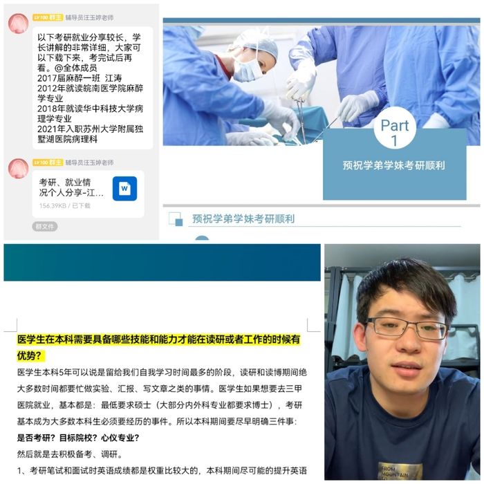在辅导员汪玉婷的积极联络下,就业于华中科技大学同济医学院附属协和医院的钱昊博士,就读于上海交通大学的博士生童朝阳等10余名2017届员工、青年医师通过拍摄视频、文档分享、图片展示等线上方式,分享自己在工作、学业、科研等方面的经历经验,为2020级的同学们解答了关于医员工自身能力提高、麻醉就业前景、工作薪资待遇、考研深造方向、院校医院选择等实际问题,尤其对于考研、规培和就业等内容进行了重点指导,对于同学们即将迎来的实习和毕业后方向选择有着重要的帮助。
