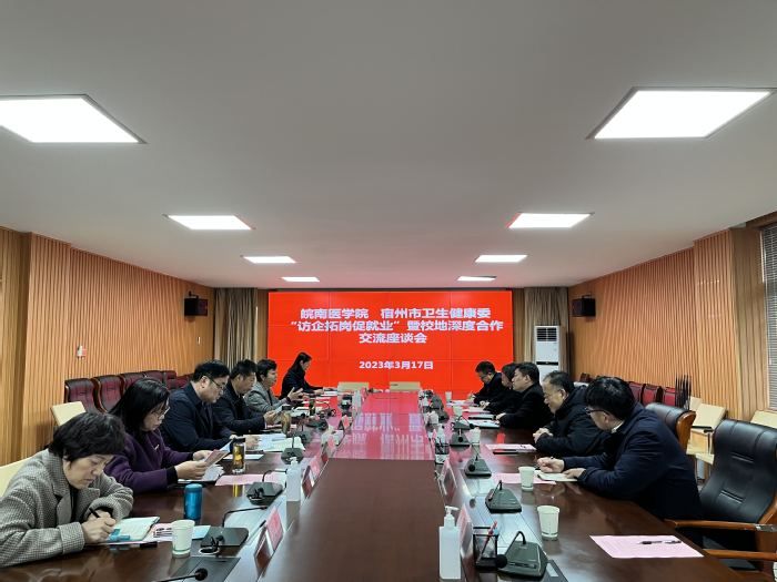 在宿州市立医院参观结束后,韩永升一行与宿州市卫生健康委员会主任牛慧琴、副主任李斌,皖北卫生职业学院、宿州市立医院、宿州市第二人民医院、中煤矿建总医院、皖北煤电集团总医院、宿州市中医院相关负责人进行了座谈交流。双方就教学医院建设、人才招引、实习生培养、科研合作、校地共建等交换了意见。宿州方面表示会面向公司毕业生发布“致在皖南医学院的宿州学子的一封信”进行专项招聘。