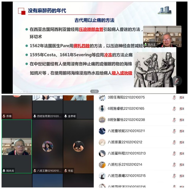 金秋九月,丹桂飘香。为了更好的提升麻醉学新生们对自身专业的认知度和学习能力,提升对学科及专业前沿领域发展状况的了解,122cc太阳成集团于2022年9月29日晚在腾讯会议线上开展“奋斗正青春 启航新征程”入学教育暨年级大会,特邀公司杰出员工、客座教授姚尚龙教授作“砥砺责任担当,不负青春韶华”主题讲座。会议由122cc太阳成集团副经理郭文俊主持,122cc太阳成集团原经理金孝岠教授,麻醉公司党委书记、副经理许国飞,麻醉公司党委副书记张卉,年级辅导员昂锋以及全体2022级新生参加会议。