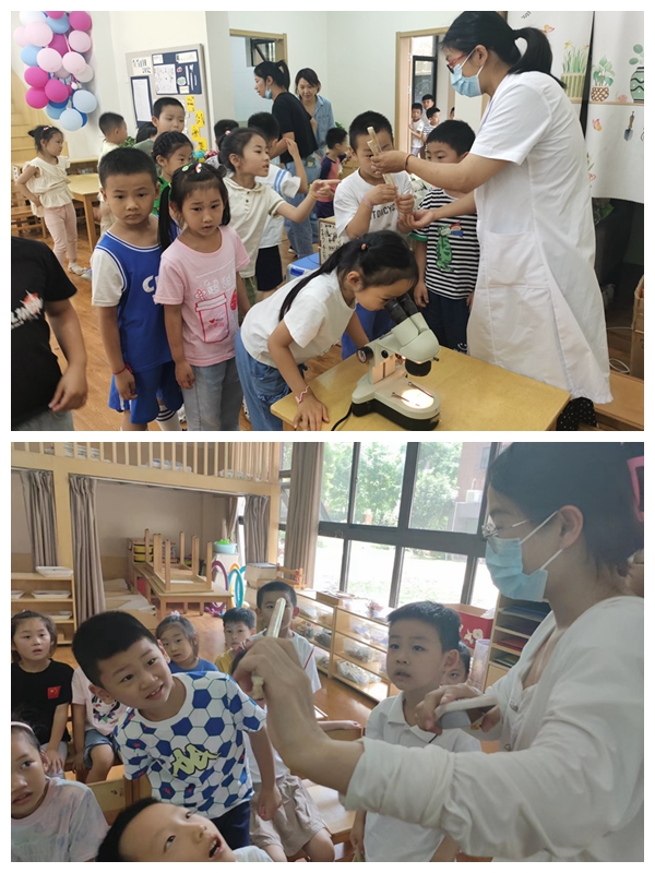 医学寄生虫学党支部赵金红、湛孝东和谷生丽老师向小朋友们介绍寄生虫病及其感染方式,通过动画片宣传预防寄生虫病的措施,提醒小朋友们爱干净、勤洗手、勤剪指甲、不喝生水、不吃生食,并以图片展示相关寄生虫病的临床症状。支部其他老师带领小朋友们观看蛔虫标本,使用显微镜识别螨虫,现场积极互动,小朋友们热情高涨。