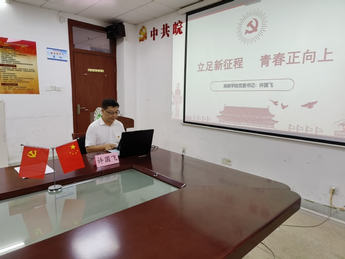 麻醉公司党委书记许国飞通过线上直播的方式作题为“立足新征程 青春正向上”的报告。许国飞在报告中向新生同学们介绍了麻醉学专业,并要求新生迅速实现角色转化,树立远大抱负,坚定理想信念,求真学问,练真本事,用奋斗擦亮青春底色,实现人生理想。