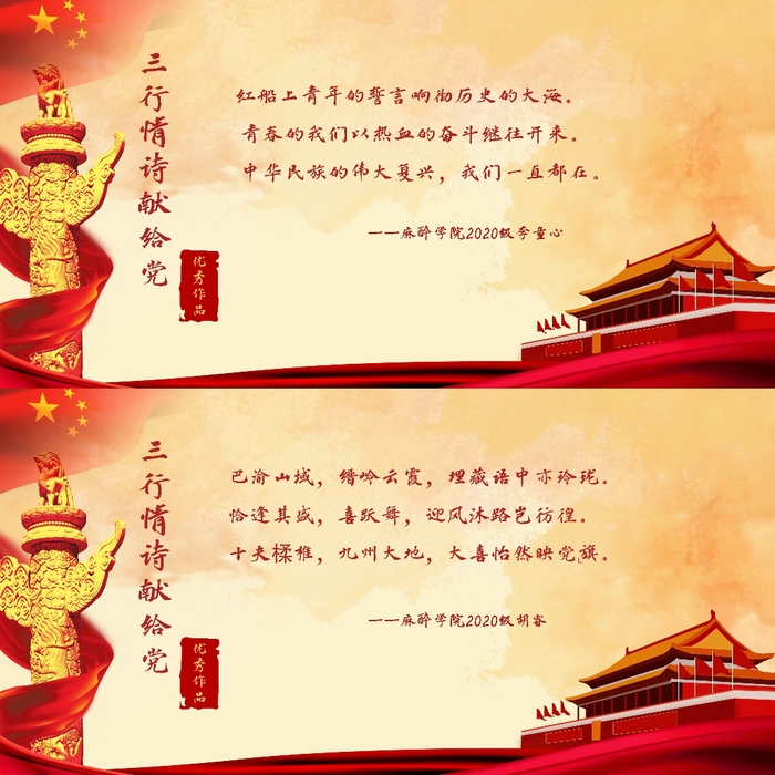 122cc太阳成集团团委组织开展以“请党放心,强国有我”为主题的写给党的三行情诗,字少言多,纸短情长,青年学子以真挚的心,最真诚的情来表达对党和国家的祝福,用简短凝练的三行语言写下了献给党的赞歌,坚定表达对党和伟大祖国的美好祝愿。