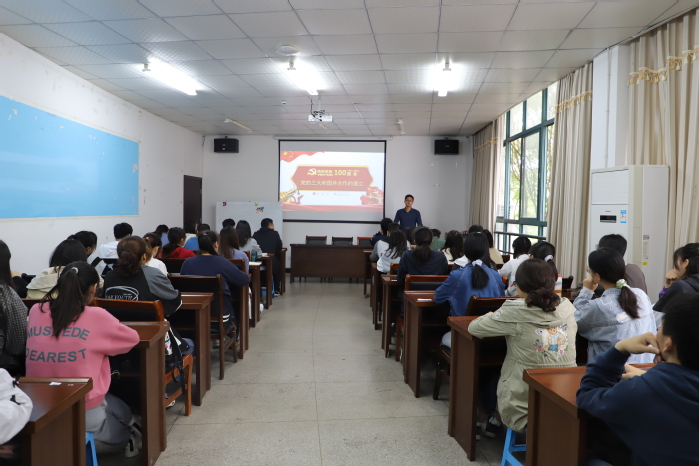 包鹏举以《新时代、新青年、新担当》为题,从中国共产党、中国共青团的诞生之初的渊源讲起,着重向同学们介绍了中国共产党的开天辟地、敢为人先的首创精神,坚定理想、百折不挠的奋斗精神,立党为公、忠诚为民的奉献精神。而共青团作为党的助手和后备军,新时代共青团员要坚持发扬“党有号召、团有行动”的优良传统,在学习党史中传承精神、汲取力量、牢记使命,认真履行引领凝聚青年、组织动员青年、联系服务青年的职责,接过属于新时代青年的接力棒。明张君以《中国共产党简史——党的三大和国共合作的建立》为题,讲述党的三大首开建立革命统一战线先河,是中国共产党建立革命统一战线的第一次伟大实践,它确立的统一战线,经过反复实践和发展,成为中国共产党战胜强大敌人、夺取中国革命胜利的三大法宝之一。