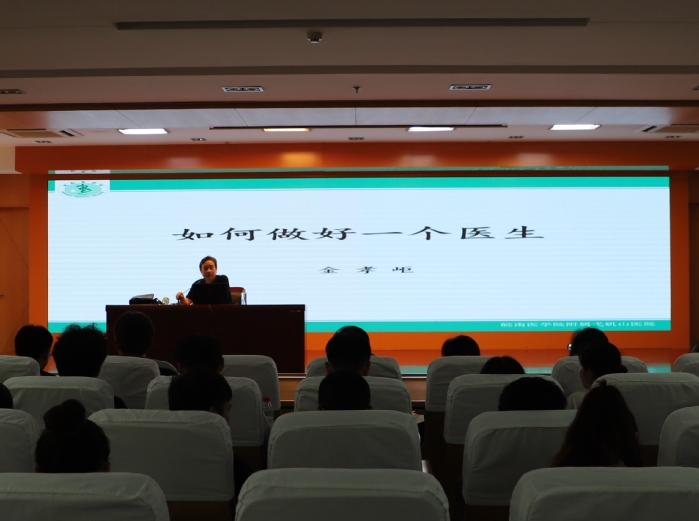金孝岠以《如何做好一名医生》为题,生动地结合自己的求学、工作的经历,从诊断能力、治疗能力、自学能力、语言能力、计划能力、科研能力、创新能力、协作能力等8个方面翔实地向同学们阐明如何做好一名医生,并勉励同学们正确规划自己的职业生涯,掌握扎实的基础知识和过硬的临床技能,明确自己的目标,抓住机遇,择己所长、择世所需,努力成为一名优秀的医务工作者。讲座现场他还与同学们进行了互动,并就同学们关心的就业、考研等问题进行了耐心地解答。