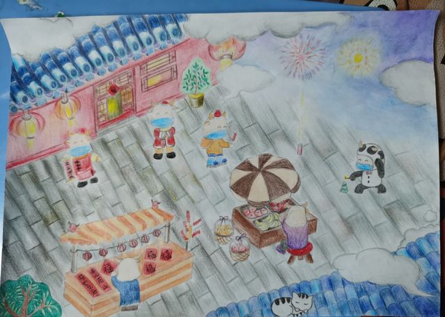 静赏同学的画作,艳丽色彩与白纸的碰撞,铸就一幅幅锦绣画卷,年味随之跃然纸上。