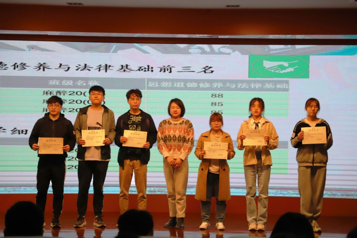会议伊始,辅导员汪玉婷带领同学们回顾了大一上的学习成绩,宣读了班级排名、年级前二十名及各单科前三名同学名单,在同学们热烈的掌声祝贺之下,被表彰同学依次上台领取奖状。辅导员汪玉婷对这些学习榜样表示了热烈的祝贺,并希望全体同学以他们为榜样,在学习上更加刻苦勤奋,你争我赶,做专业优秀、德智体美劳全面发展的新时代医员工,在五年大学路上不负韶华,砥砺前行。