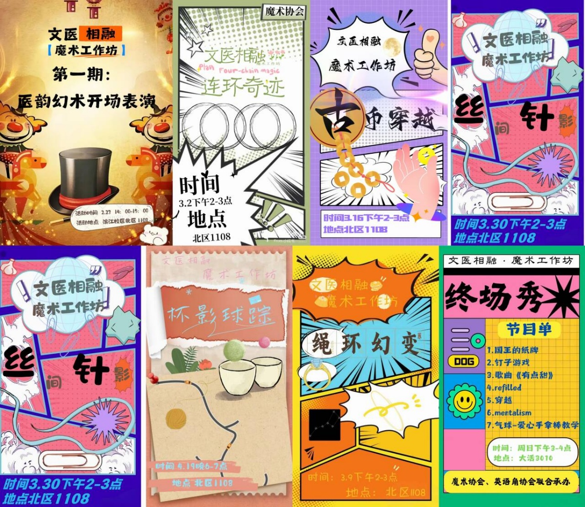 活动期间,协会每周举办一期魔术工作坊,围绕“医员工的跨界灵感”展开,巧妙地将医学知识融入魔术教学。“医韵幻术”表演以中医文化为灵感,魔术师借助草药、古钱币等元素演绎传统医学,让观众在奇幻效果中感受传统文化魅力;“绳环幻变”结合急救绳结知识,“杯影球踪”解析视觉暂留原理,“丝间针影”以针灸为灵感演示别针穿丝巾技巧,让同学们直观理解“魔术背后是科学”。同时,每期设置学员展演环节,50余名同学上台尝试“古币穿越”“扑克幻影”等魔术,在互动中提升表达能力。